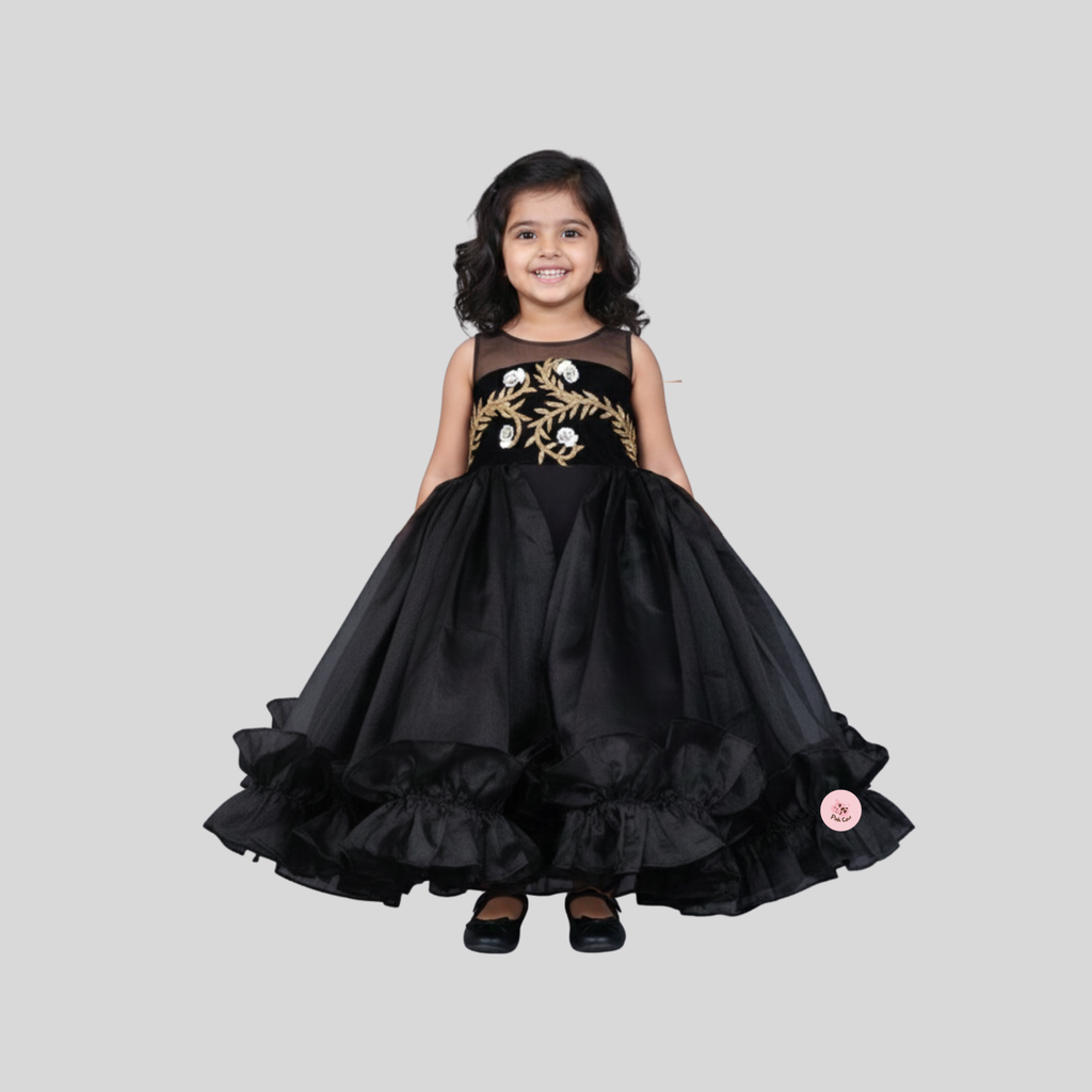 - Fashionable Flared Party Gown With Short Skirt in Black Scuba Embellished With Gold Embroiderey