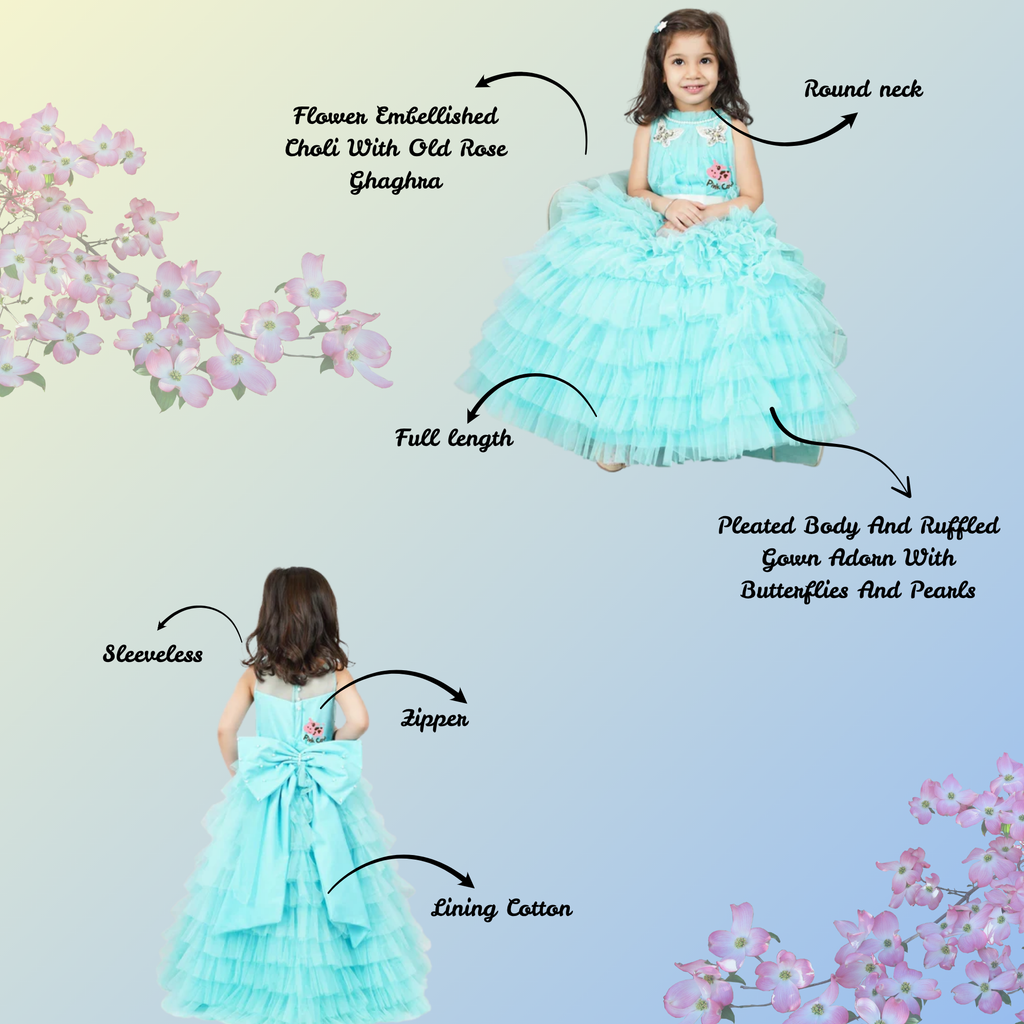 - Pleated Body And Ruffled Gown Adorn With Butterflies And Pearls