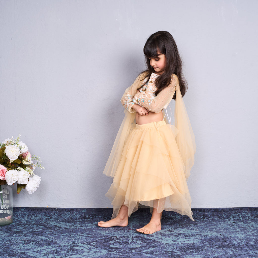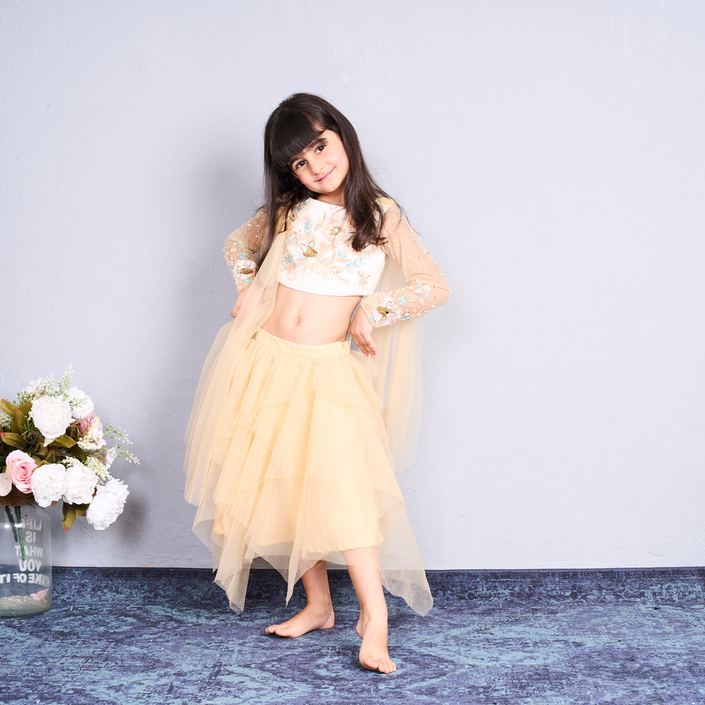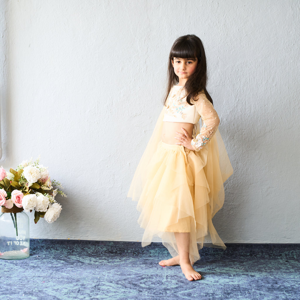 - The outfit features a cream and gold embroidered crop top with full sheer sleeves embellished with delicate floral work.