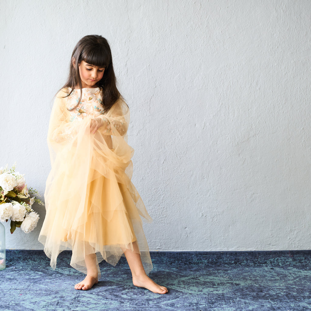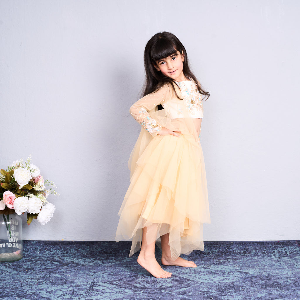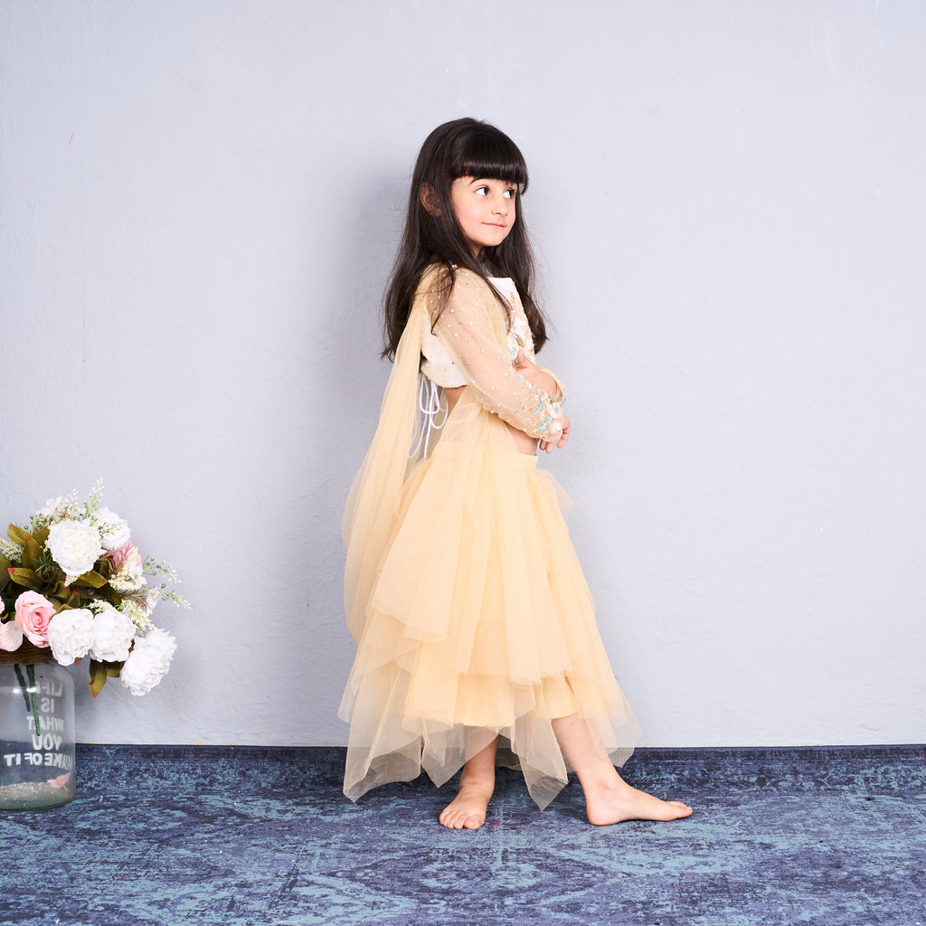 - The top is paired with a flowing, layered yellow net skirt that gives a soft and elegant appearance.