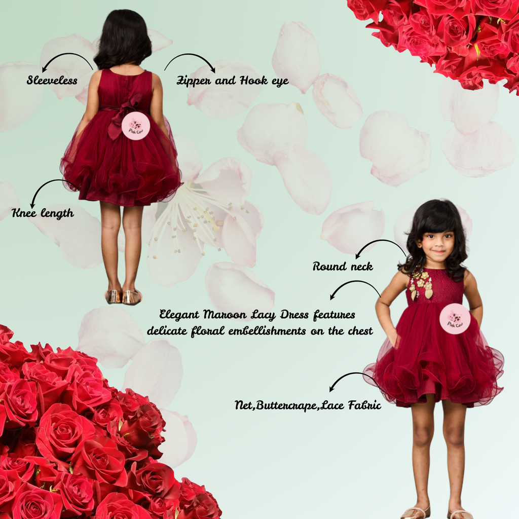 - Elegant Maroon Lacy Dress features delicate floral embellishments on the chest