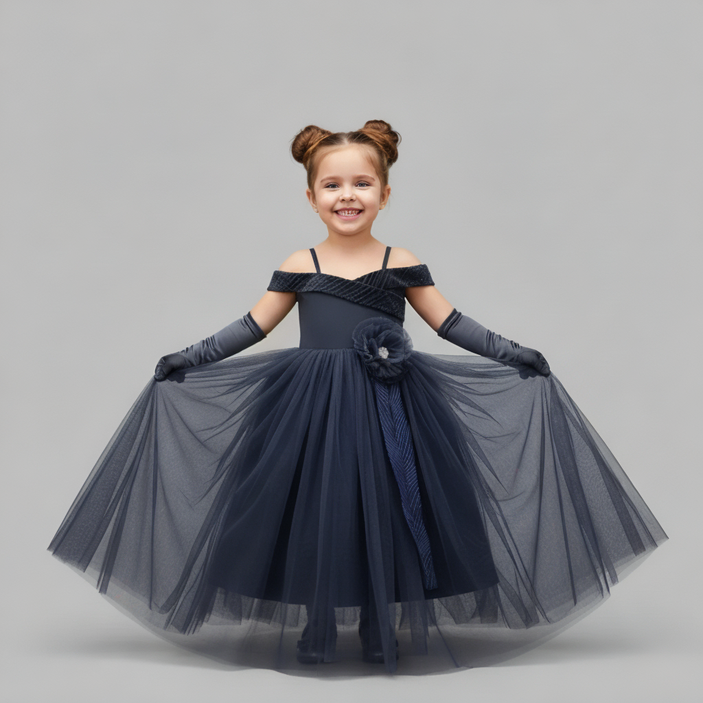 - Stylish & fashionable girls flower embellished party gown in net with crepe lining