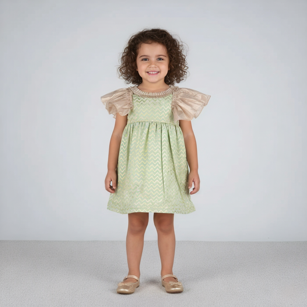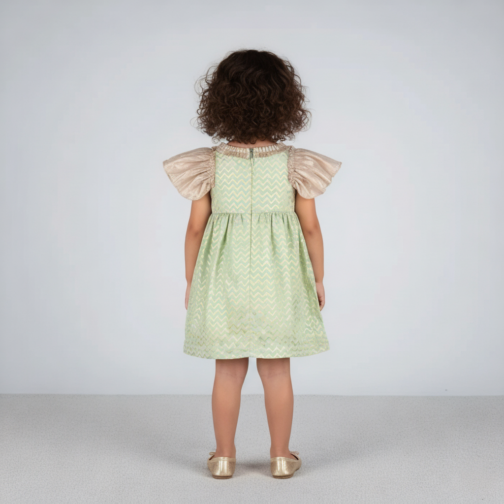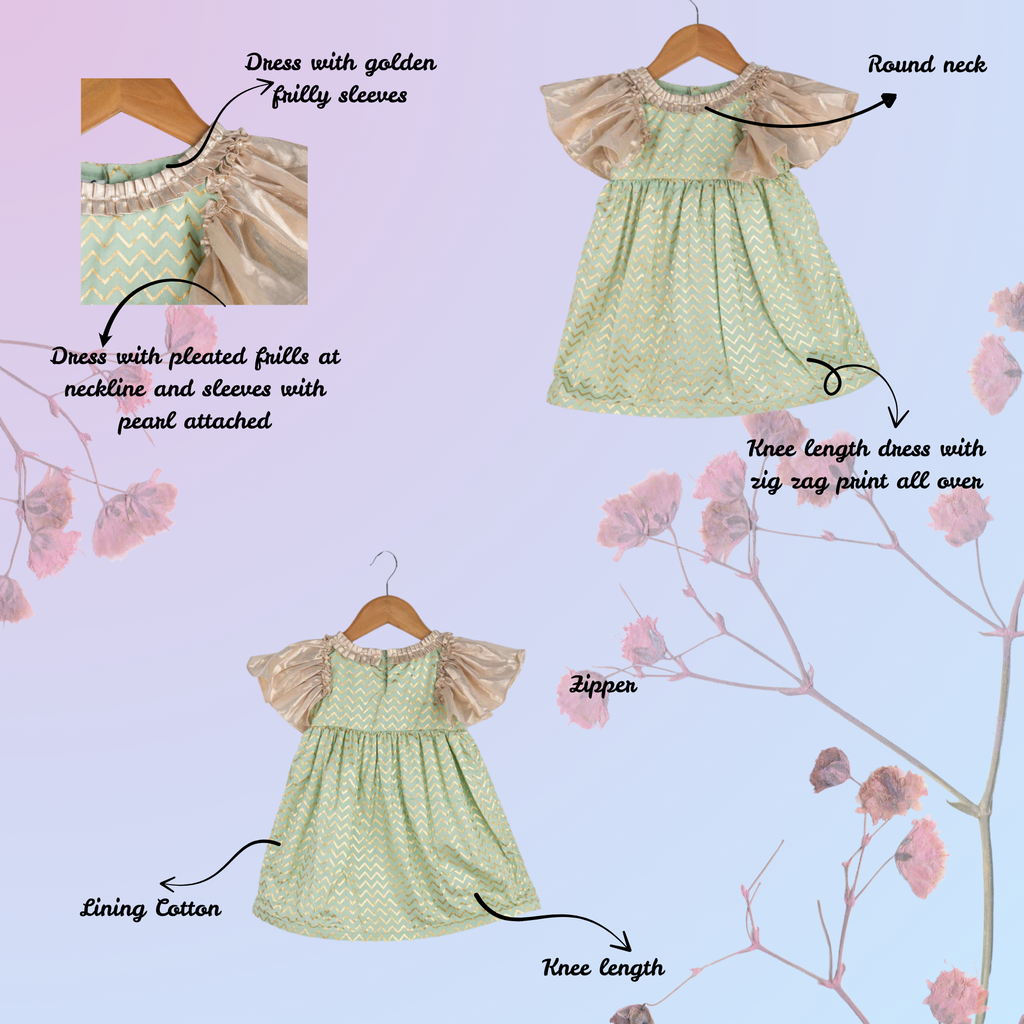 - Dress with pleated frills at neckline and sleeves with pearl attached