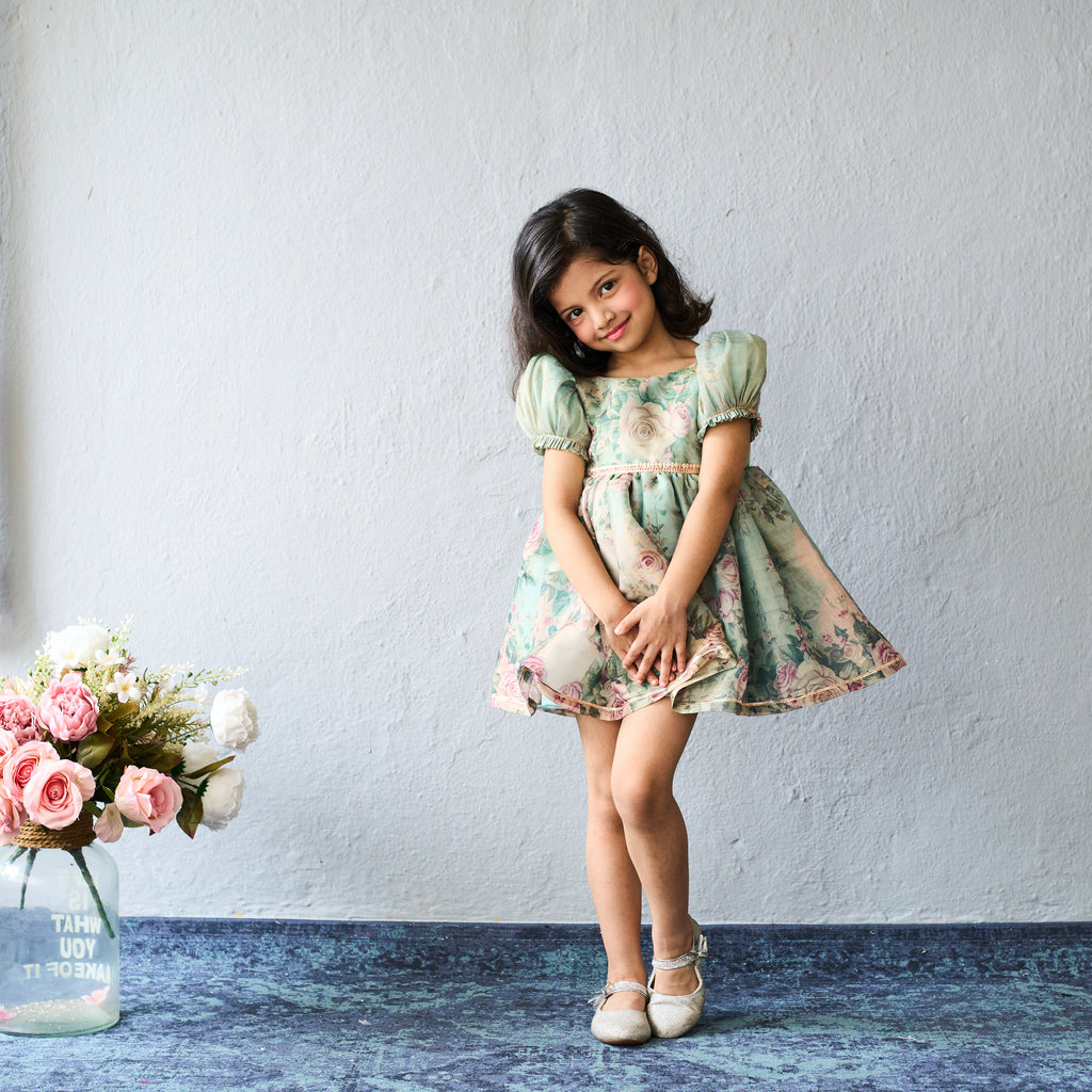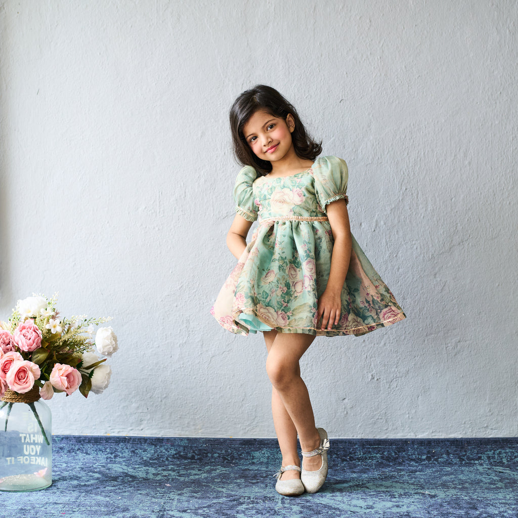 - The dress is a pastel green frock with an all-over floral print in soft pink and cream tones.