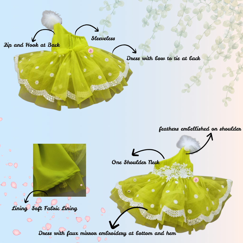 - One shoulder dress with sequins, and feathers embellished on shoulder