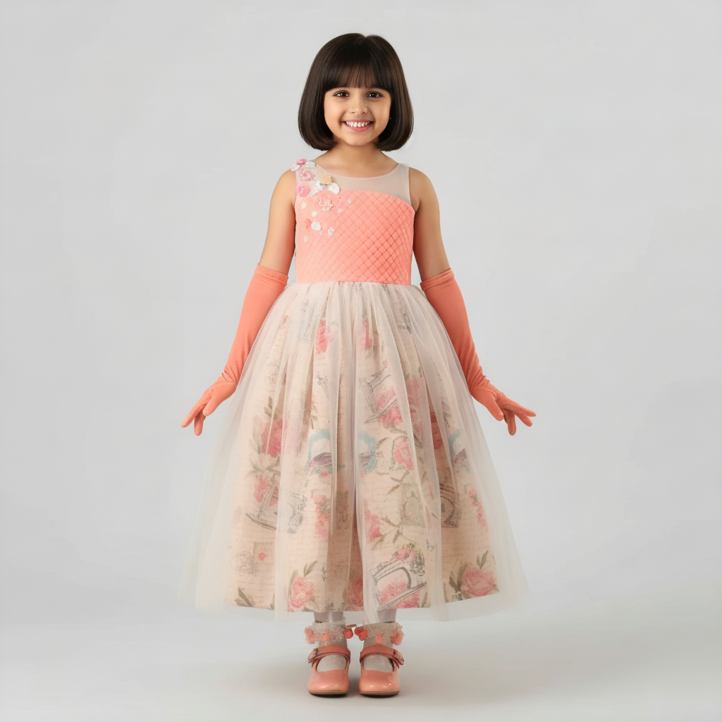 - Embellished party gown with print and embroidery